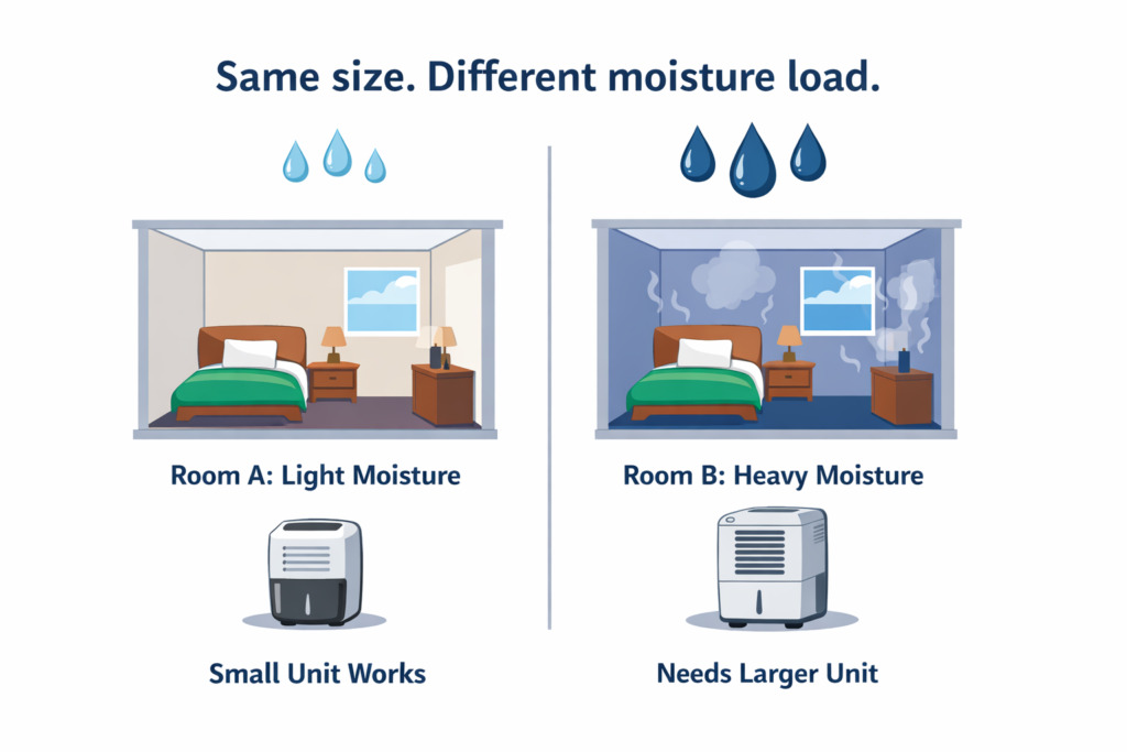 Dehumidifier sizing is about moisture load, not square footage alone.