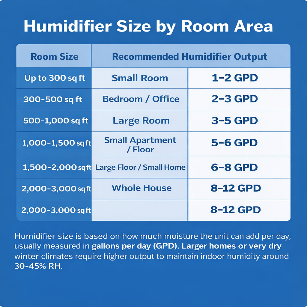 Humidifier sizing is about matching moisture output to your space and climate rather than simply buying the largest machine available.